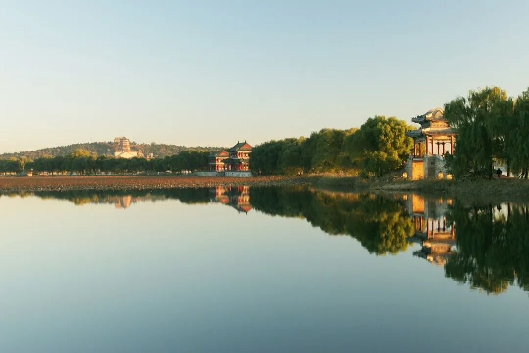 颐和园的亭台、长廊、殿堂、庙宇和小桥等人工景观与自然山峦和开阔的湖面相互和谐、艺术地融为一体,堪称中国风景园林设计中的杰作。
